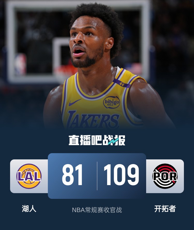 比赛上来,湖人进入状态较慢,前三分钟被开拓者打出一波9-0的开局,不过之后湖人的三分投开逐渐追了回来,次节开拓者重新占据场上主动权,分差也是来到两位数,这一节湖人的得分未能上20分,半场结束时开拓者领先15分;下半场回来,场上局势没有任何改变,湖人的进攻依旧不好,同时让开拓者拿下31分,分差也是直逼三十分,末节布朗尼抓住机会有一次扣篮,不过比赛早已失去悬念,最终开拓者大胜湖人结束连败。