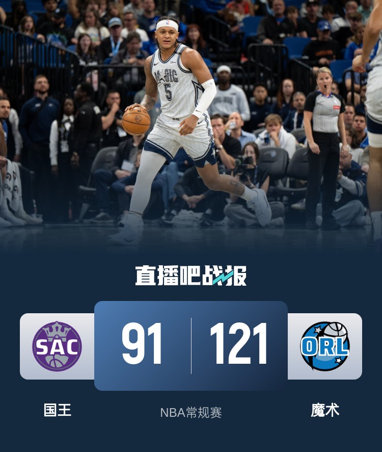 比赛开始,魔术上来捍卫主场打出10-1不错开局,但小萨连续内线强打或造杀伤砍下9分强势回应,双方展开拉锯战,魔术替补也是全民皆兵首节领先17分,次节国王连续追分,但魔术外线连续发炮10-2直接拉开20分以上领先,德罗赞里突外投单节上双止血,半场魔术依然领先15分。下半场,国王依靠三分止血,但魔术接连突破回应重新拉开20分以上领先,随后魔术连续3记三分轰出12-1攻击波一举拉开30分以上领先,末节双方很快进入练兵时间,魔术牢牢掌握住大比分领先,最终魔术121-91大胜国王。