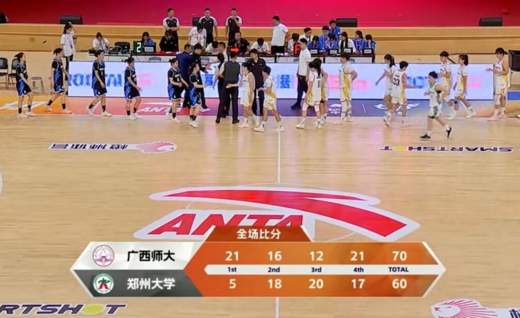 次节上来,王跃华抢断加三分带队5-0打停广西师大,随后广西师大连续内线打成止血回应,邓嵌纹继续得分,双方展开拉锯战。鲁玉婷和王璇连续三分命中,广西师大再次拉开比分,半场广西师大37-23领先郑州大学。