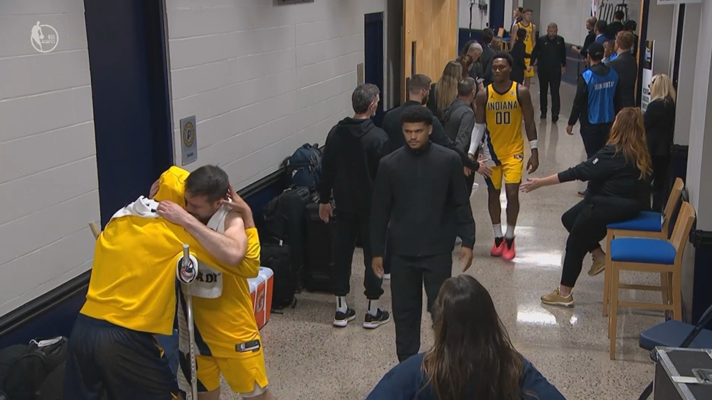 步行者就有点惨了,哈利受伤,球队的配合也乱了套。赛后看到哈利在球员通道里拄着拐杖地迎接队友,那背影真是让人心疼。不过,比赛就是这样,有赢就有输,希望步行者能快点调整过来,下赛季再战!