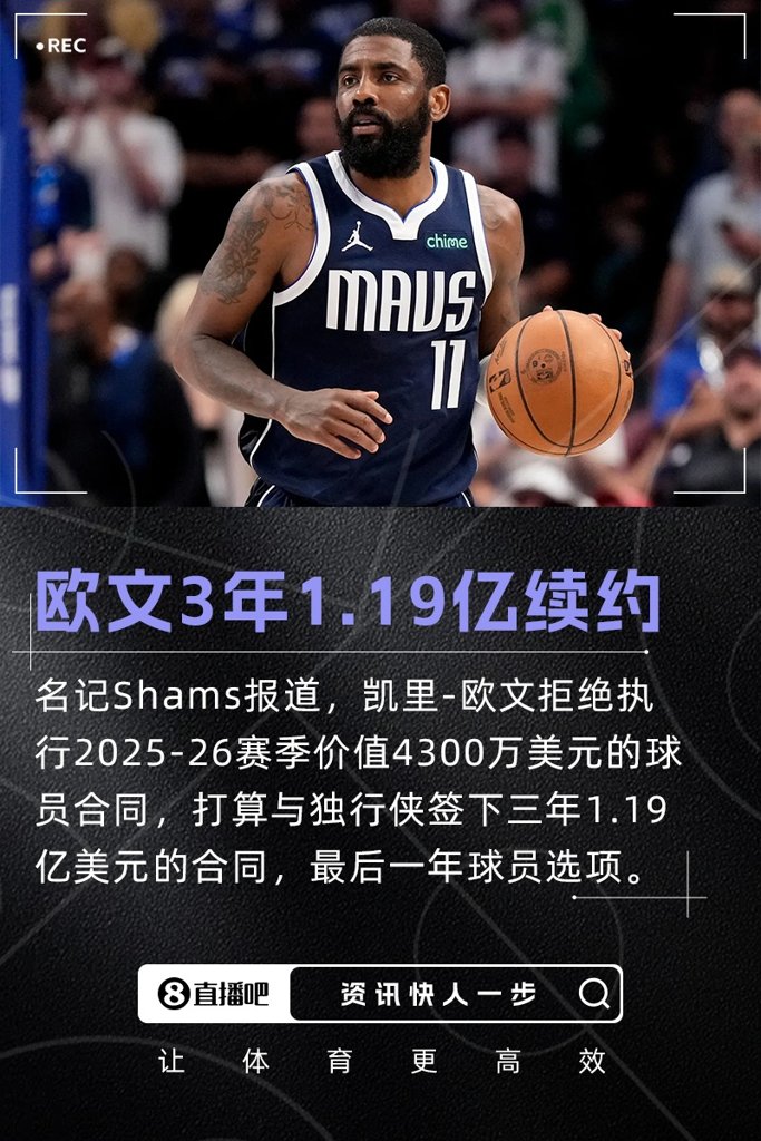 06月25日讯 名记Shams报道,凯里-欧文拒绝执行2025-26赛季价值4300万美元的球员合同,打算与独行侠签下三年1.19亿美元的合同。