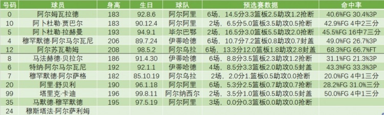 其他球员中,12号阿尔苏瓦勒姆是他们的内线支柱,国家队生涯场均两双,在本届亚洲杯预选赛期间场均13.3分12.0篮板,另一位内线阿尔马尔瓦尼兄弟中的哥哥,如今已经36岁高龄,比赛效果较之阿尔萨瓦勒姆已经有所差距。其他球员中,00号阿尔姆瓦拉德是后场主将,法哈德-贝拉尔在预选赛场均出手7.8次三分,虽然命中率不理想,但显然是球队的主要射手;而小阿尔马尔瓦尼可能是沙特运动能力最强的球员,具备一定的冲击力乃至回追封盖能力。