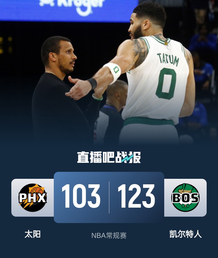 开场后布克一度连续拿分帮助太阳取得微弱优势,随后塔图姆站出来连续拿分帮助凯尔特人反超比分,太阳一度靠打入内线咬住比分,第一节尾声凯尔特人一波8-0的攻势再度将分差拉大。第二节上来普里查德和杰伦-布朗轮番砍分帮助太阳将分差拉大到20分。此后太阳通过奥尼尔和伊戈达罗一内一外的发挥追赶比分。易边再战,凯尔特人依旧是全面开花打得有声有色,布克挺身而出单节砍下14分帮助太阳勉强保留希望。最后一节凯尔特人整体发挥依旧稳定,布克努力带队追分但还是难以缩小分差,最终凯尔特人123-103送给太阳5连败。