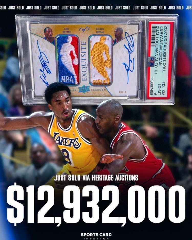 8月24日讯 据The Athletic报道,一张独一无二的2007-08赛季Upper Deck Exquisite Collection系列乔丹与科比双LogoMan(来自他们各自比赛穿过的球衣上的NBA标志补丁)签名补丁卡,在(美国当地时间)周日凌晨通过Heritage Auctions拍卖行以1293.2万美元的价格售出。