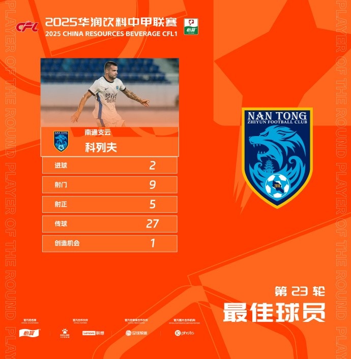 9月23日讯 中甲联赛第23轮最佳球员公布,南通支云的外援科列夫当选。