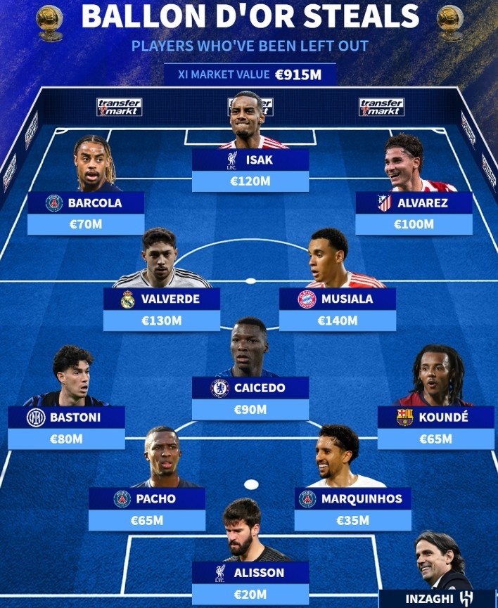 9月23日讯 德转列举了未获得今年金球奖提名的11人阵容,伊萨克、巴尔韦德领衔。