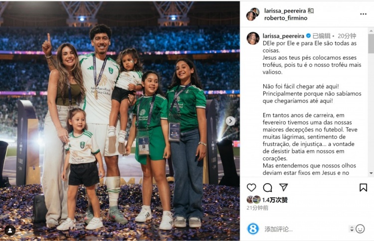 菲尔米诺本赛季出战12场亚冠比赛6球7助,当选亚冠最佳球员。菲尔米诺妻子拉莉萨社媒晒出一家合照,庆祝夺冠。