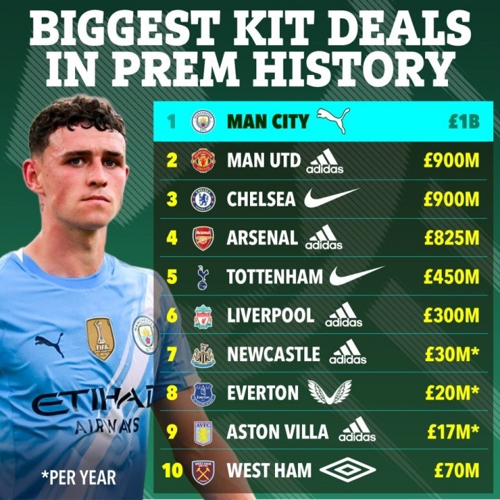 曼城的这份合同也超越了曼联与阿迪达斯签订的10年9亿英镑合同,以及皇马与阿迪达斯的8年9.5亿英镑,成为足坛历史最大的球衣赞助合同。