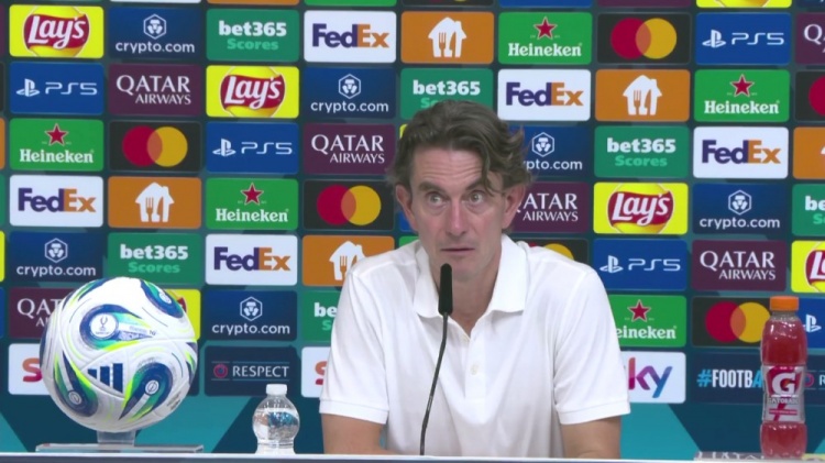 8月14日讯 欧洲超级杯决赛,热刺在常规时间2比2与巴黎战平,最后在点球大战中惜败。赛后,热刺主帅弗兰克在新闻发布会上接受了热刺记者阿拉斯代尔-戈尔德与其他媒体的采访。