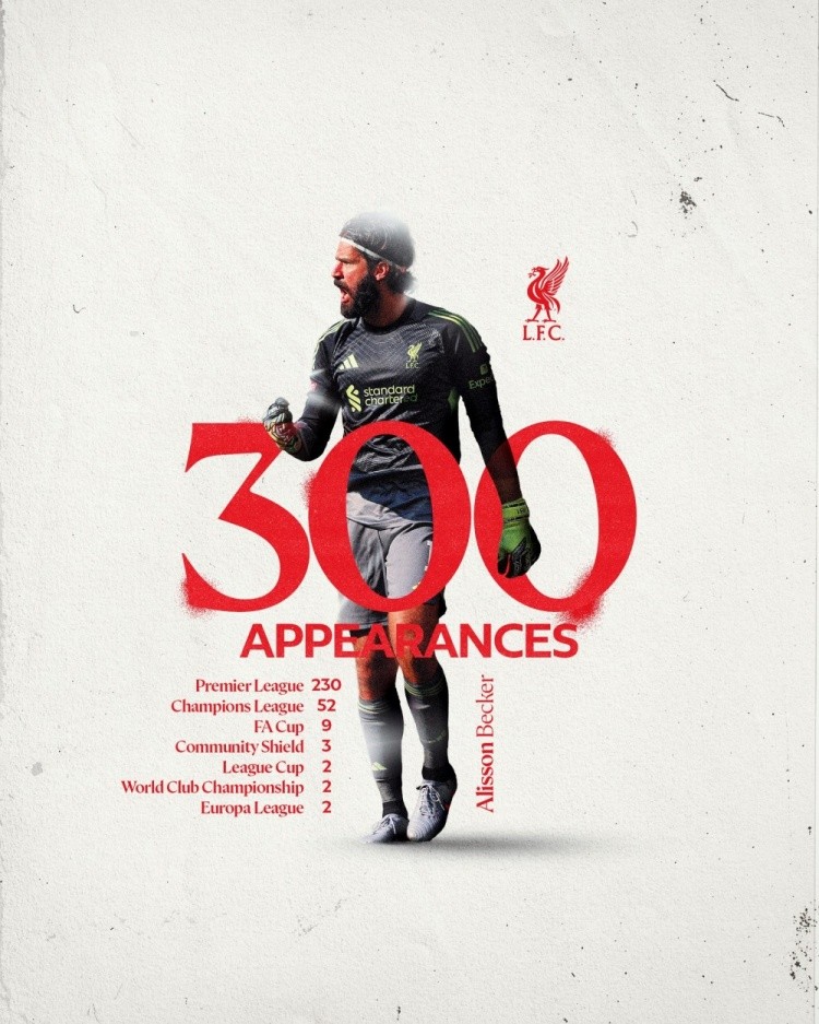 据利物浦官方统计,这是阿利森代表利物浦出战的第300场比赛。