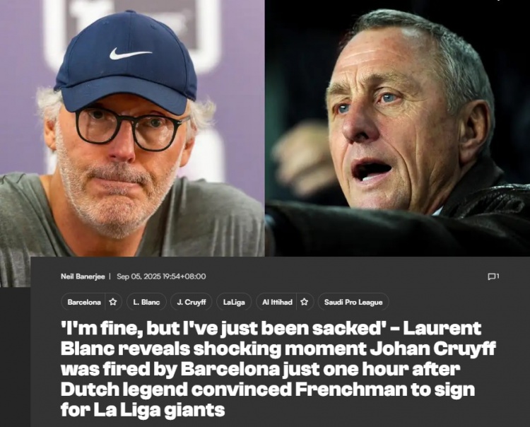 “于是我心里想:‘我要去巴塞罗那,然后签约。’这很有趣,我当时甚至已经拿到了合同。当我到达巴塞罗那时,克鲁伊夫对我说:‘好吧洛朗,你将与我们签一份两年合同,然后我们会踢这样的足球。今天晚上我带你去一家餐厅,我们聊聊具体怎么踢球。’但是一个小时后,他就被解雇了。