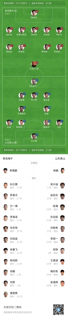 青岛海牛首发:22-韩镕泽、3-刘军帅、4-金洋洋、26-尼古拉-拉德马诺瓦(F)、37-韦所为、6-菲利佩-奥古斯托(F)、7-萨里奇(F)、8-林创益、34-金永浩、11-韦林顿-席尔瓦(F)、60-兰克尔-泽(F)